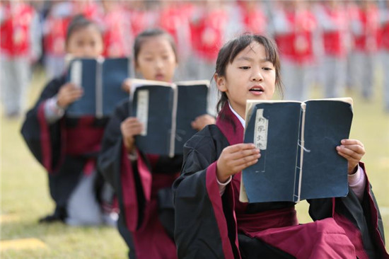 第二幕名为“雅”,取《诗经》中的“雅”之意,即正声雅乐。由仓上、东风校区的学生及家长一千多人共同完成该部分演出,所选取的曲目均是“经典之作”,旨在通过乐曲体验让学生体验汉唐文化和礼仪,告诉学生们为人处世的道理。仓上校区的孩子们表演了《新学堂乐》《读唐诗》《三字经》《弟子规》《千字文》等经典的颂唱。在歌唱家刘克清演唱由作曲家甘霖根据刘邦诗歌《大风歌》创作的歌曲《大汉沛歌》歌声中,东风校区的近千名学生手持“沛筑”模型进行表演。作为中国春秋时期产生的古老击弦乐器。“筑”曾编入宫廷乐队,而后一直被称为“沛筑”,宋朝以后失传。2010 年 5 月中旬,中国民族乐器学会会员郝敬春历经 18 年的探索研究,将失传千年的筑回复研制出来,并获国家专利。目前,“沛筑”被收集进入北京金帆音乐厅民族器乐博物馆展柜,其演奏技艺同时被收进民族器乐博物馆演奏课程。引导中小学生对这件乐器进行关注、了解、学习,可激发他们对中国乐器制作、中国民族音乐、中国历史的兴趣与探究。如何利用中国传统音乐文化开展音乐教育,郭志平团队在“高参小”课程中做了有心人,他们将《新学堂乐歌》在课堂上进行运用,将很多做事的道理以艺术的形式浸润到孩子们心中。“高参小”课程团队通过把“沛筑”这件复原乐器的徐敬春传承人请进东风小学教育集团为音乐教师们传授演奏技法,组织师生把根据“沛筑”原型构建并制作成乐器模型,由学生上色、排演等一系列实践活动,让师生得以对古代音乐文明有直观了解和感受。