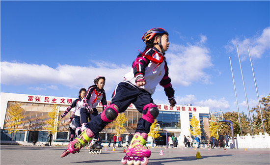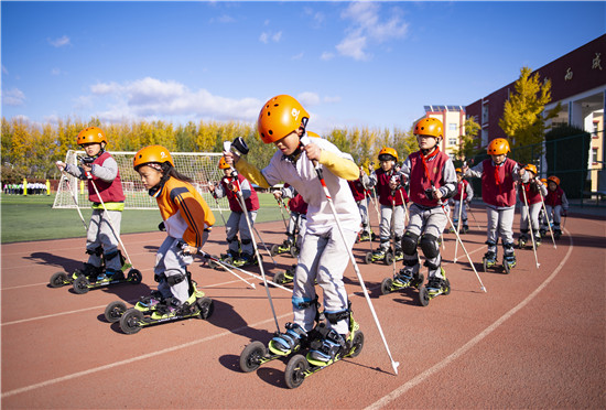 一群孩子们动作协调有力,在塑胶铺就的篮球场地里轻快地滑翔,如贴着地面飞过的燕子,轻盈又婀娜;另一群孩子则手持滑雪杖,脚踏带轮滑雪板在操场跑道上飞速前进;还有一群孩子在白色挡板围成的“冰池”里正在上演冰球决战……他们个个技艺娴熟,动作规范,就好像在真正的冰场上、雪地上进行着各类项目的比赛。