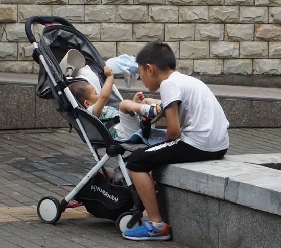 小哥哥看弟弟很有耐心,即使小脚踢到身上也不恼。笑槑/摄