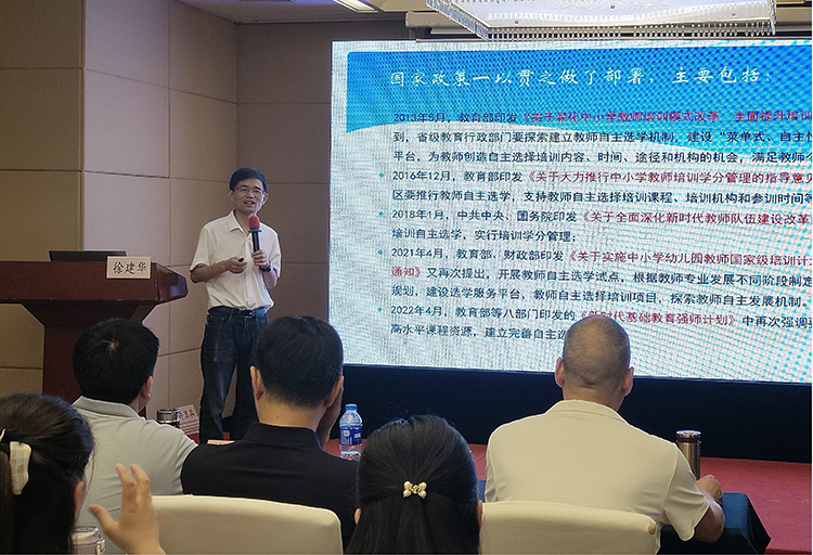 9月15日下午,教育学博士、副研究员徐建华带来《浙江省基于分层分类的自主选学教师培训改革》的分享。他详细介绍了自主选学培训项目的政策背景及发展,分享了典型案例,并讲解了浙江省自主选学的做法和经验。学员们认真学习,积极思考,从浙江的经验中汲取智慧,为探索自主选学项目及教师培训改革的新路径拓宽了思路。