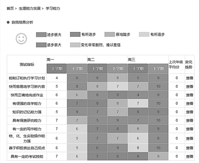 在这一系统的创建与应用过程中,学校首先通过实践与实证研究寻找“树”的根脉,也就是影响学生成长的关键因素,明确了三个高关联要素,即自主发展、学会学习、规划人生,由此建立学生成长模型。其次,在成长模型基础上,形成了学生成长系统的三大模块,并细化模块内容及评价指标:一是能力发展自评模块,包括“学习技能、学习习惯、学业毅力、情绪调控、人际交往”等5个维度42项指标,基本覆盖了学生在高中学习生活的各个方面;二是全学科学业数据的分析评价模块,此模块一方面针对学生高中三年的学业情况进行过程性的质量分析与评价,另一方面依据学校多年来的数据平台和各高校专业实际录取分数线进行数据库常模积累及匹配,方便学生及时调整自己的目标与行为;三是职业专业测评模块,依据此模块建立了学生兴趣方向、人格特质与大学专业、社会职业之间的关联,帮助学生自主理性选择与规划自己的人生方向。