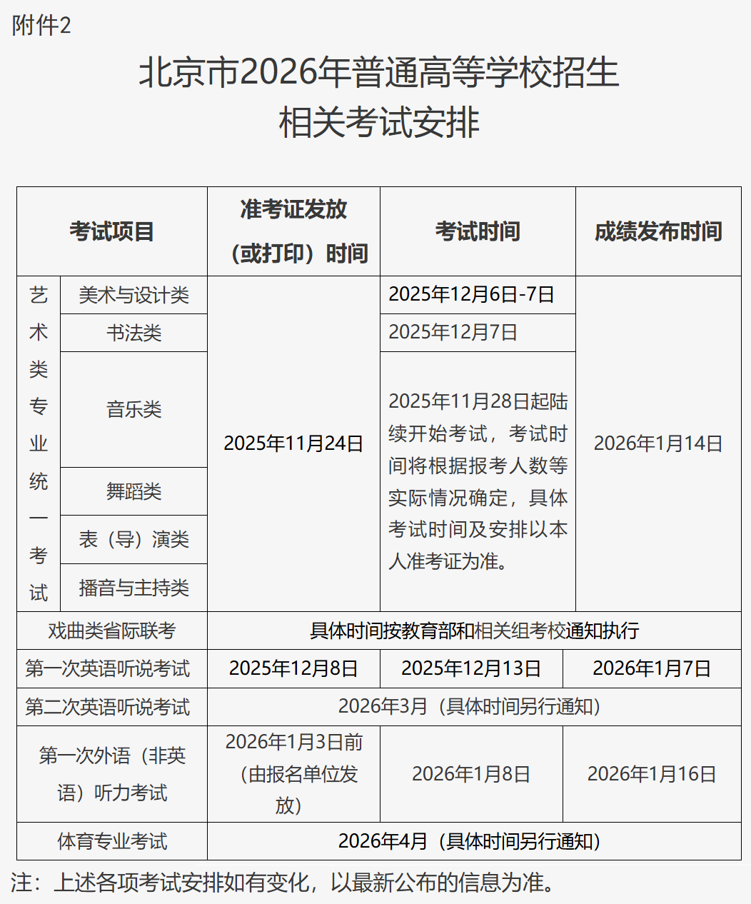 (四)2026年普通高等学校招生艺术类专业统一考试、体育专业考试、英语听说考试、外语(非英语)听力考试报名与高考报名同期进行,符合条件拟报名参加相关考试的考生须选报相关项目并缴费。部分考试的时间安排见附件2。