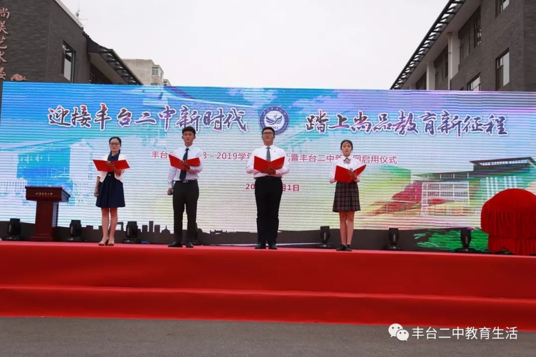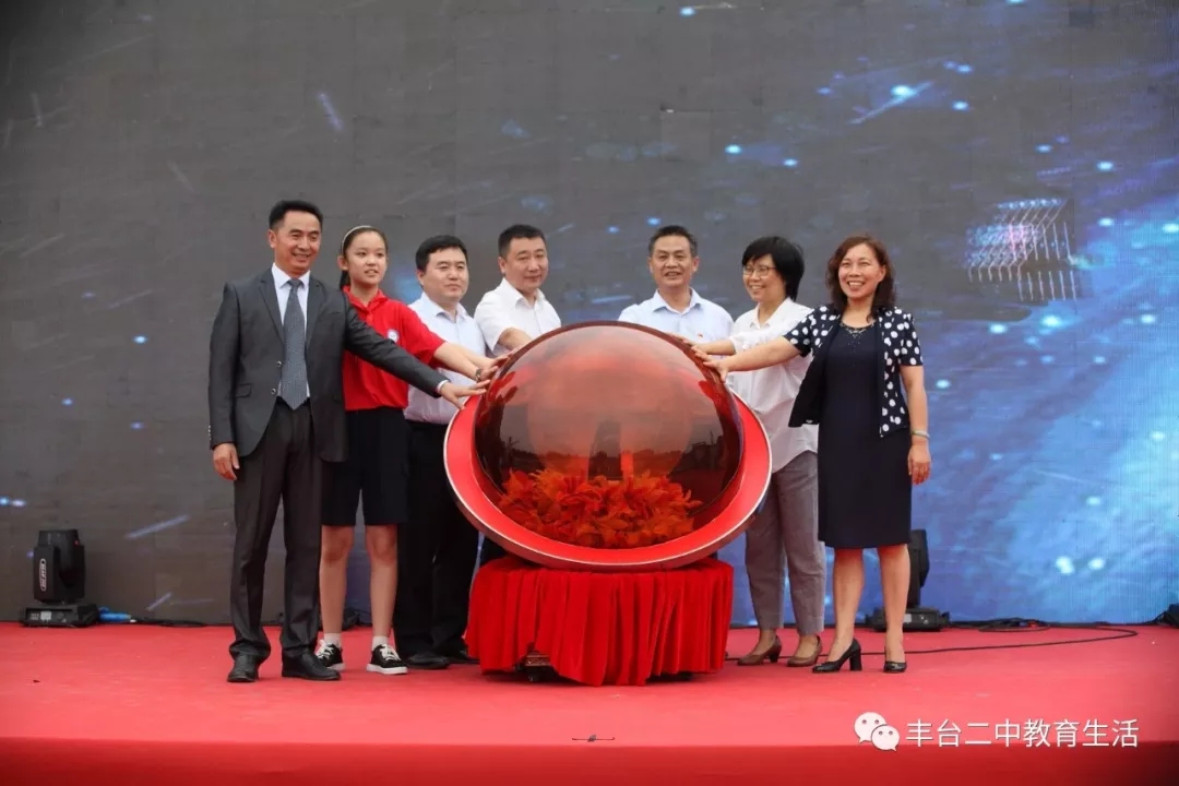 随后,丰台街道办事处工委李广民书记、丰台区教工委薛红书记、丰台区教委张洋主任、丰台区政府教育督导室刘建宾主任、丰台二中何石明校长、丰台二中党委焦素琴书记与学生代表走上舞台,按动激光球,以崭新的方式开启新校园,开启丰台二中教育集团的新篇章,丰台区教工委薛红书记宣布:北京丰台二中新校园正式启用!丰台二中人对新校园十几年的祈盼终得梦圆。霎时间,欢呼阵阵,掌声雷鸣,无论是老校友还是新同学,都为学校在新时期再上层楼而喜悦。