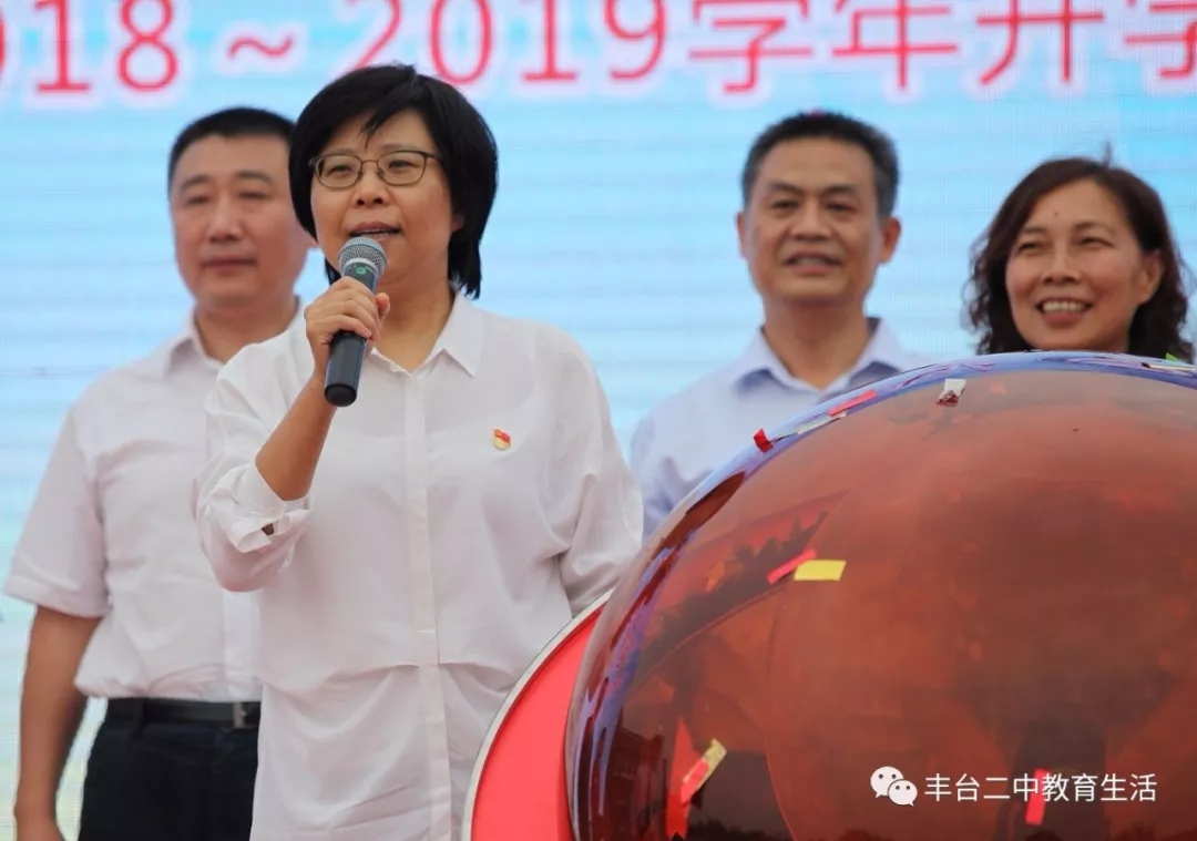 丰台区教委张洋主任致辞,介绍北京丰台二中改扩建工程的基本情况,祝贺丰台二中师生喜迁新居。