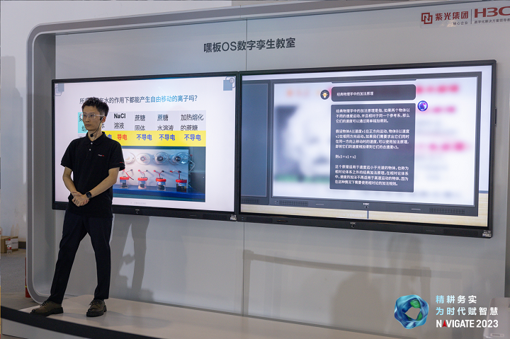 新华三教育云屏搭载嘿板OS专属大屏系统,开机即进入黑板界面,提笔即可书写板书,极致的交互体验,老师零学习成本即可上手操作,是一款全数字化“黑板”。峰会现场,嘿板OS数字孪生教室方案,通过双联屏全数字化黑板,将老师、板书、课件三大课堂要素进行1:1课堂真实还原,数字孪生虚拟人像强势吸睛。嘿板OS数字孪生教室,摒弃了过往高造价以及设备繁杂的录播教室,只需要新华三教育云屏以及一个后置网络摄像机即可完成环境搭建,自研算法实时跟随,轻松实现远程互动教学,打破空间边界,并且一键即可进行课堂同步录制,多终端分发,高清回溯教学过程,为教学内容沉淀结构化数据。