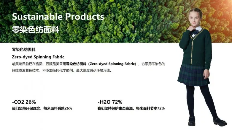 哈芙琳将回收塑料瓶加工成特殊纱线,减少纺织企业碳排放,构建绿色环保生产,唤醒行业的环境保护意识;在冬季校服融入“3M新雪丽棉”科技保暖材料,发挥“轻、薄、暖”功能特性,赋予于专属学生的暖冬新体验。
