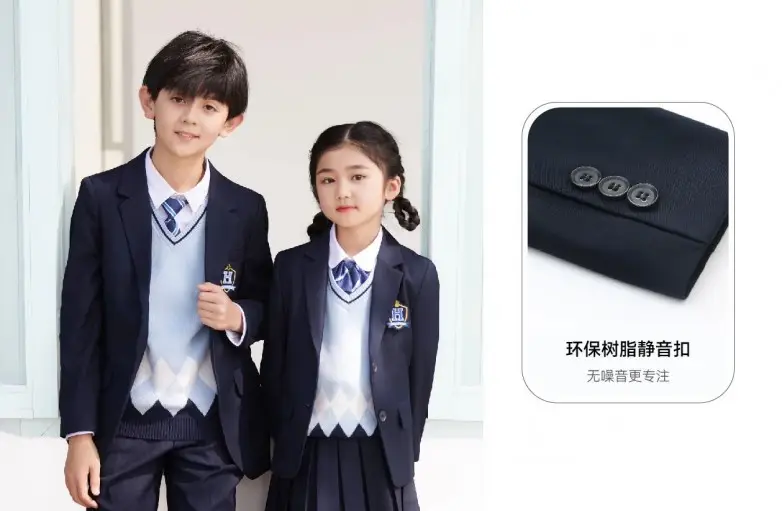 应用夜视反光贴条,为校服装备增加科技新亮点,为学生带来全天候的防护;充分考量课堂教学环境,在校服正装上应用环保树脂静音纽扣,保证课堂安静,让学生更关注于学习;采用成长性思维设计,在裤腰和裙腰处,提供可延伸设计,保证孩子穿着舒适性。