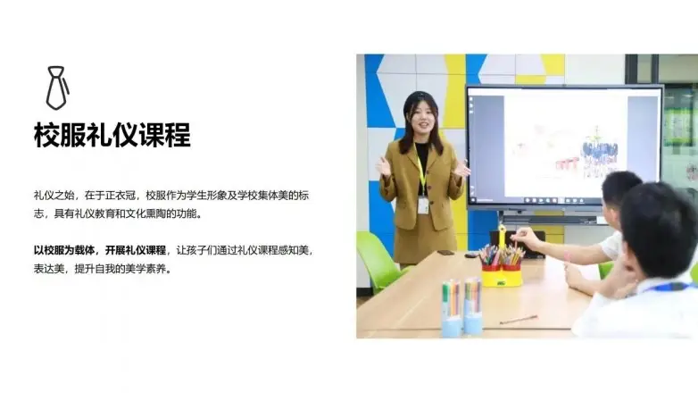 开展校服礼仪课,融入学校课程体系,让孩子们通过礼仪课程“感知美、表达美、提升自我的审美修养”;